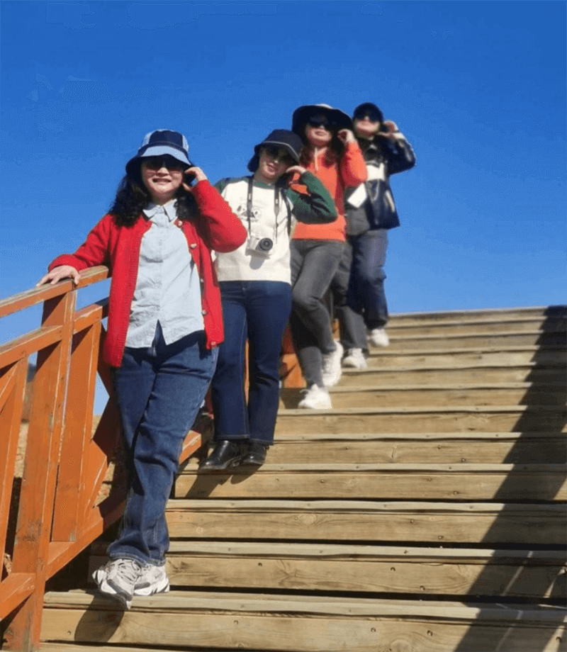 ↑集團(tuán)高管楊華女士和員工在五彩灘合影留念